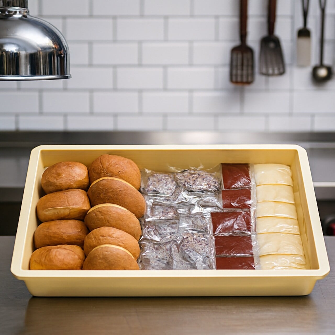 ・パティ:牛肉、豚肉、牛乳、パン粉、卵、玉ねぎ、香辛料(塩、胡椒、ガーリック、ナツメグ、パプリカ、クミン、シナモン)